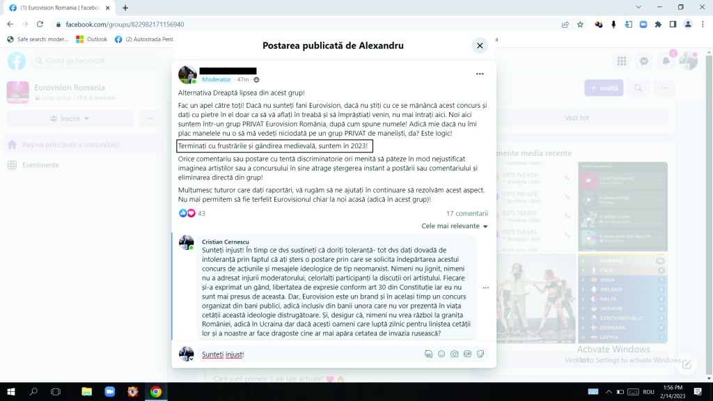 Postarea a avut mai multe distribuiri dar doar în grupul Eurovision România am întâmpinat probleme. La început unii au dat un simplu Like iar alții au apreciat postarea cu diferite emoticoane, unele cu râsete, altele cu furie și altele cu plânsete. După ceva timp, a început și dezbaterea din partea membrilor grupului asupra mesajului distribuit, unele fiind în acord cu mesajul distribuit iar altele în dezacord. Unii și-au exprimat punctul de vedere pe tonuri civilizate iar alții pe tonuri mai puțin civilizate dar, la un momendat au venit și ușoare amenințări și șantaje în public și privat din partea unui moderator ori a altor membri: