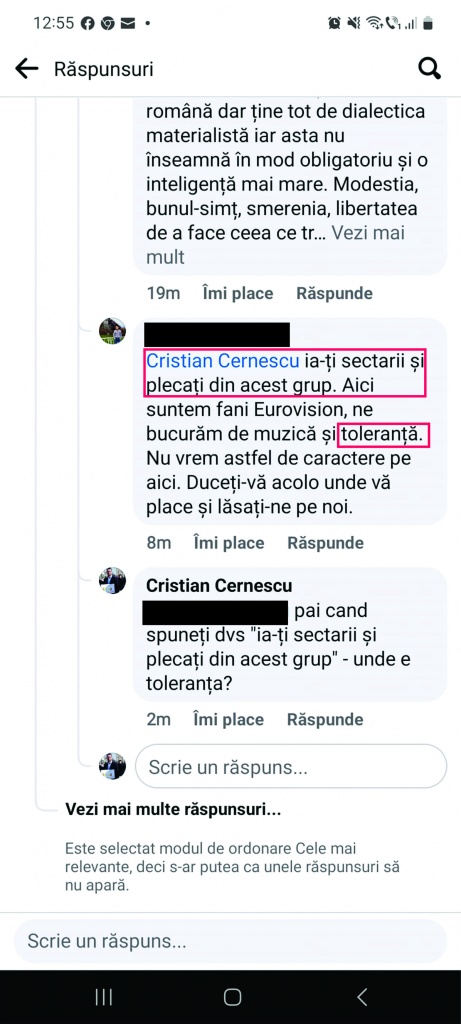 Ulterior, postarea a fost ștearsă și mai mulți cunoscuți, poate chiar și necunoscuți, au fost dați afară din grup dar lucrurile au continuat pe profilul meu după ce am criticat intoleranța de care au dat dovadă.